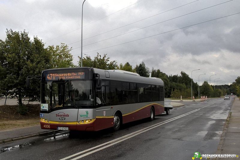 06.09.2015 r. Bolechowo, ul. Obornicka. Przystanek: Bolechowo/Fabryka Autobusów. Od 05 września ZGK w Swarzędzu obsługuje linię rowerową nr 471 organizowaną przez powiat poznański w relacji Swarzędz/Dworzec PKP - Biedrusko/Park. Tym samym także na wyświetlaczach zaprogramowałem logo powiatu ;-) Do obsługi linii skierowane zostały autobusy #4006, #4007 i #4009.