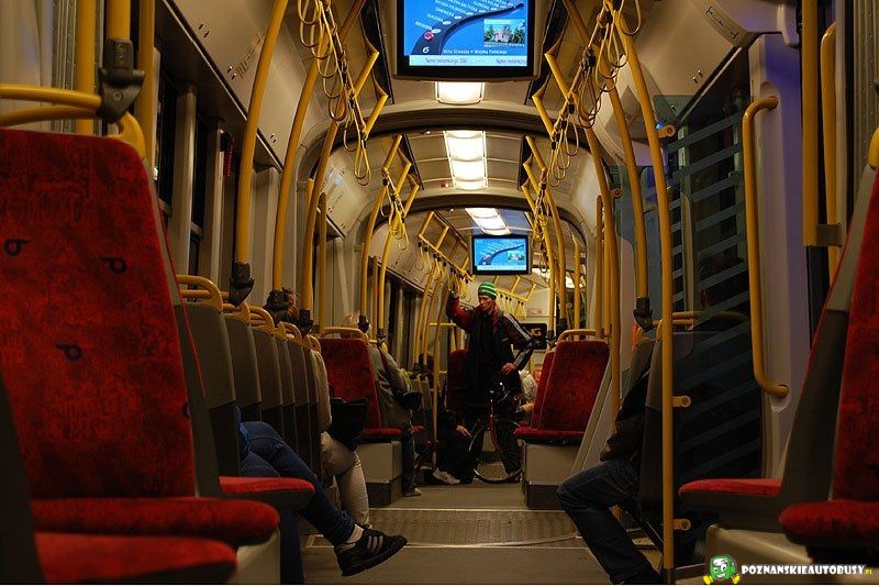 Wnętrze Pesy, jest ok, miękkie fotele, przyjemna jazda. Siedziałem na końcu wagonu, motorniczy chyba nie widział gdzie się wagon kończył, bo na skręcie gdy ostatni wózek jeszcze go nie opuścił, dawał gaz na maksa i mało mnie z fotela nie zwaliło, było słychać, że wózek jest na skraju wytrzymałości. Na telewizorach, dodam, że są one obustronne, pokazywało, że jesteśmy na Dworcu Głównym, a byliśmy przy Operze Bałtyckiej, dodam, że zapowiedzi były podawane poprawnie.