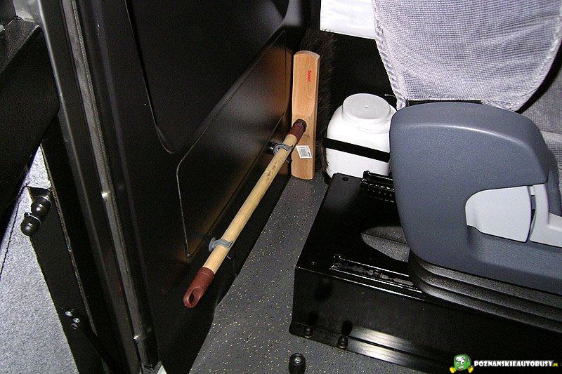 W kabinie fabryczne wyposażenie, miotła i pojemnik na płyn neutralizujący zabrudzenia podłogi.