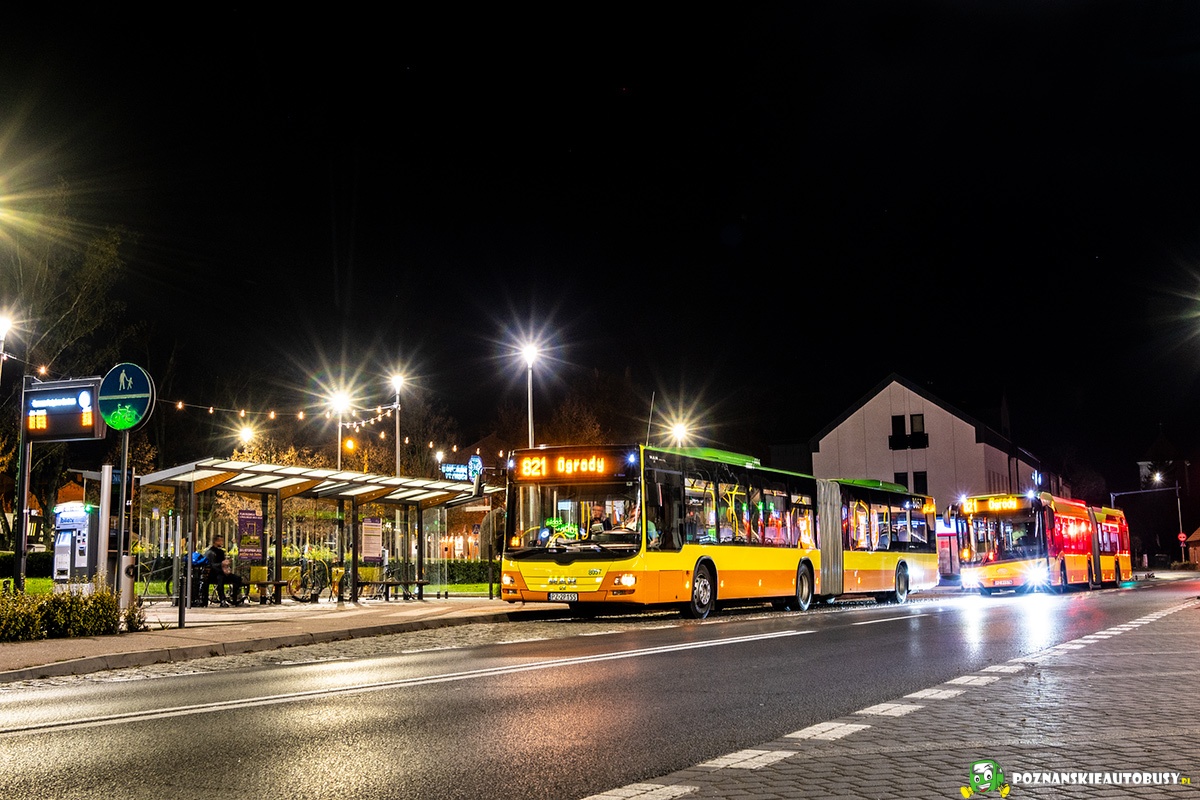 W tle Solaris 8048 który kończy kurs z Lusówka Rozalin, zaraz zjedzie do zajezdni, a pasażerów w kierunku Poznania zabierze dalej MAN.