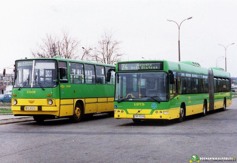 Os. Sobieskiego, 2001 r. Ikarus 280 #1519 i testowe Volvo 700A #1375 oczekują na odjazd na starej pętli.